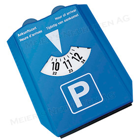 Parkscheibe aus stabilem Kunststoff mit Eiskratzer, Gummilippe und auf der Rückseite eine Halterung für 2 Stück (1 Euro) Einkaufswagenschips oder Kleingeld.
