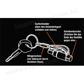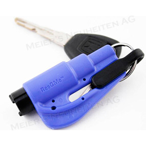 ResQMe ist ein einzigartiges tragbares und sehr handliches Sicherheitshilfsmittel, welches als Schlüsselanhänger getragen werden kann. Dieses kleine Werkzeug erlaubt allen Menschen bei einem Unfall aus der sogenannten “KFZ Falle” zu entkommen. Der ResQMe Bolzen spannt sich erneut selbständig nach Gebrauch und kann somit immer wieder genutzt werden. Die Klinge ist extrem langlebig und kann viele Male zum zerschneidens von Gurten gebraucht werden. Zum den Notfallhammer zu aktivieren drücken Sie den schwarzen Aufsatz einfach gegen eine Scheibe, bis die darunterliegende Feder den Schlagdorn innen herausschleudert und das Fenster zertrümmert.