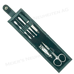 Manikürset bestehend aus Nagelschere, Nagelknipser, Nagelfeile, Pinzette, Nagelschaber und Nagelstab.