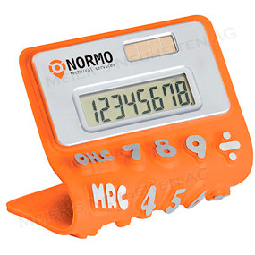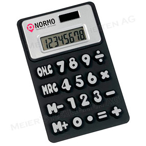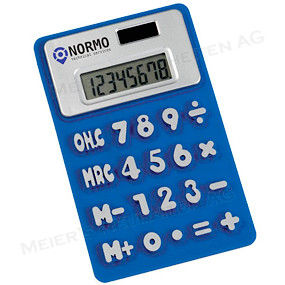 Bemerkungen: Rutschfester Taschenrechner aus flexiblem und weichem Kunststoff mit integriertem 8-Ziffern Display und Dualpower.