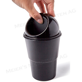 Bemerkungen: Mini-Mülleimer aus Kunststoff, einsetzbar als Tischmülleimer oder KFZ-Mülleimer (Platzierung im Getränkehalter)