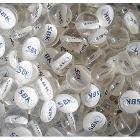 Wir können die Flummis Aussen- oder mit einem Innendruck auf einer Motivscheibe beidseitig bedrucken. Selbstverständlich können wir auch 3D Objekte in den Flummi Einbetten!