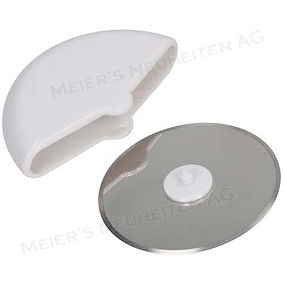 Bemerkungen: Pizzaschneider mit stabilem grossem Schneidrad mit einer runden Klinge aus Edelstahl und einem Gehäuse aus ABS. Klinge und Gehäuse sind trennbar und dadurch leicht zu reinigen. Inklusive aufsetzbarem Klingenschutz aus Karton.