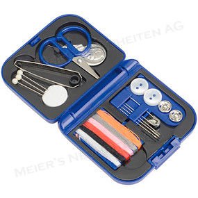 Bemerkungen: Nähset in Kunststoff-Box, bestehend aus 2 Knöpfen, 2 Druckknöpfen, 6 verschiedenfarbigen Garnen, Sicherheitsnadel, 3 Nadeln, 3 Stecknadeln, Pinzette, Schere und Einfädler.