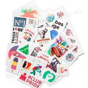 Schweiss- und Wasserfest, mit Organics Papierabdeckung, 100% Vegan, wird regelmässig dermatologisch getestet. Ob auf Events, für individuelle Promotionkampagnen oder als kreatives Give-Away – Klebetattoos bieten vielfältige Einsatzmöglichkeiten für jegliche Altersgruppen. |